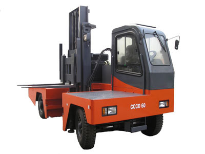 侧面叉车工作装置安装在车身侧面,除可以升降、倾斜外,还可以沿车身侧面伸缩,适用于长形货物的装卸、堆垛和运输。运输时,货物安放在货台上,对通道宽度 的要求较小,正面窄道能够快速安全运行,机动性较高,充分利用场地面积。对于各种木材、管材、线材及各种长形货物的装卸、堆垛、转运尤为适用。可以使用在 港口、码头、工厂、油田、基建工地等场所,搬运大体积的、笨重的、超长尺寸的货物。